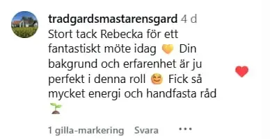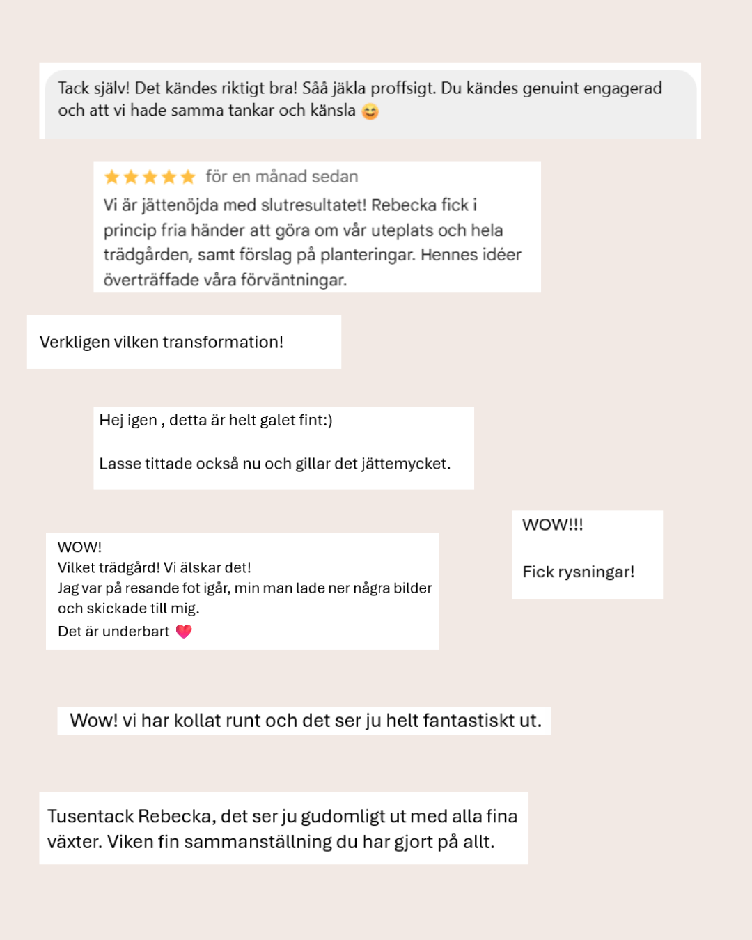 "Jag blev verkligen positivt överraskad av ritningen — det kändes som att jag fick så mycket mer än bara en rabatt! Älskar att du visar olika varianter med samma tanke bakom, och att man får en tydlig inköpslista att utgå från. Väldigt lätt att förstå direkt. Och allså, jag skulle inte rekommendera någon annan än dig Rebecka när det kommer till trädgårdsdesign — du är varm, engagerad och med riktigt bra stil."