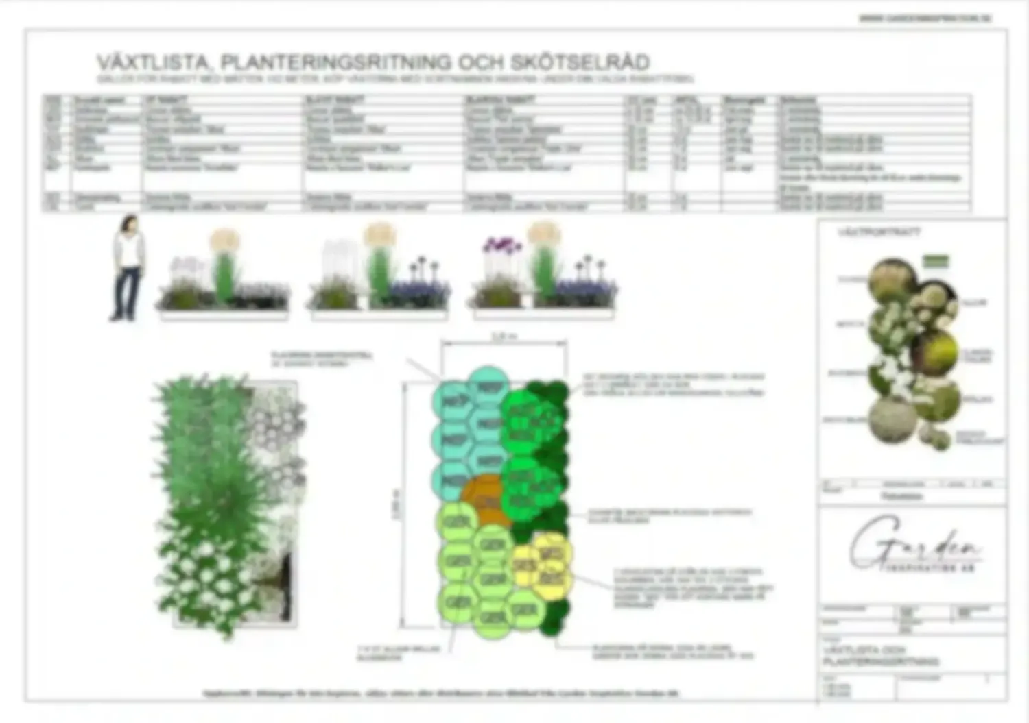 Växtlista med sort, antal, skötselråd mm.
